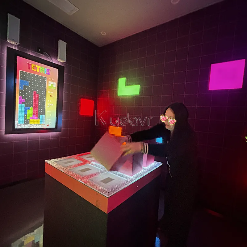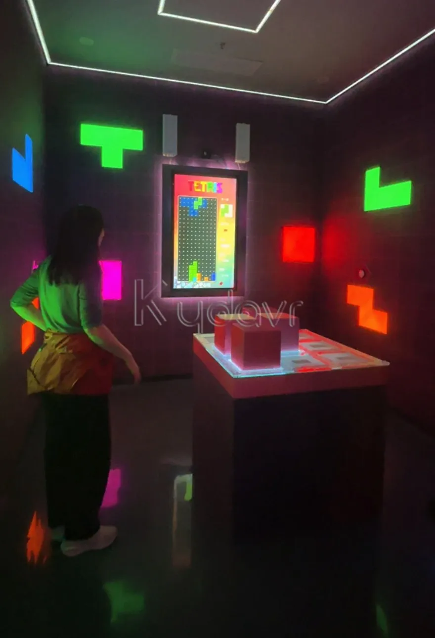 The 7 Blocks Kydavr Play Tetris Game is a groundbreaking mix of classic video gaming and real-world interaction. Inside the game room, players use oversized cubes to recreate the Tetris block shown on screen. Once completed, the digital block starts falling, and the challenge continues.